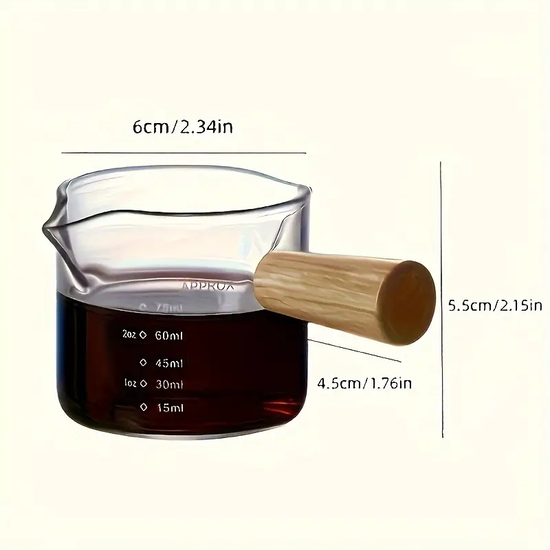doseur fabriqué en verre borosilicate, durable et résistant, avec une poignée érgonomique en bois ce doseur est parfait pour les baristas faits à la main, les cocktails, le lait, la pâtisserie, le chocolat, la confiture, le miel, les mesures de cuisine, la distribution d’ingrédients humides et secs. La tasse à mesurer à expresso est un accessoire essentiel pour votre quotidien.